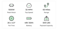 Used This bike is almost brand new, I’ve ridden it a few times trying out deliveroo. It’s just too big for my hallway so I would like to sell it. Frame Material --- Aluminium Alloy Battery --- 48V 20Ah Lithium Motor --- 1500W Peak Brushless Gear Motor Max Range --- 65 Miles (Pedal Assist) Max Speed --- 32 mph (limit to 15mph on roads UK) Torque --- 85 Nm Riding Mode --- Pedal/Pedal Assist/Throttle/Cruise Control (limit to pedal on roads UK)Upgrades: