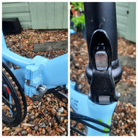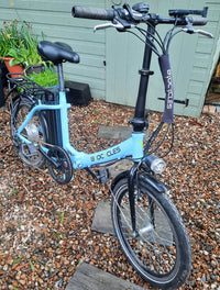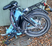 Used Byocycles LS folding Electric bicycle Road legal, (250W), Thumb throttle, Easy to use. Aluminium frame. 20" wheels 21.5KG. Folds to roughly 82cm x 79cm. 6 Shimano SIS gears. Front & rear lights. Pedals (folding). Front & rear mudguards. Rear Hub driven, 36V, 250W, brushless motor (UK legal). 5 levels of assist including walk assist. Battery indicator. Upgraded battery, 10 AH Bell. Kickstand. Lock with 2 keys. Cost over £1000 (with extras) when new. I bought it 6 years ago to use in my Motorhome, but due to a dodgy knee has hardly been used in last 3 years, hence a little bit of surface rust (see pictures). Battery has been kept in good condition by charging it at least every 3 months.Upgrades: