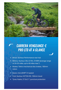 Used The bike is Brand New , boxed Model is Carrera Vengance E Pro L Size Gender Unisex Type Electric Mountain Bikes Frame MTB, alloy 6061 Forks Suntour XCT30-DS, 100mm travel Headset Semi-integrated 1-1/8" - 1.5", FSA No.11N Stem Alloy, length: 45mm length, bore: 31.8mm Handlebars Alloy, width: 760mm, risee: 15mm, diameter: 31.8mm Grips MTB, black Seatpost Alloy, 31.6mm x 350mm Saddle Carrera MTB, memory foam Pedals Alloy, flat Brake Type Mechanical disc brakes Front Brake Tektro MD-M280, mechanical disc, 180mm disc rotor Rear Brake Tektro MD-M280, mechanical disc, 180mm disc rotor Number of Gears 9 Gear Shifters microSHIFT TS39, 9-speed Rear Derailleur microSHIFT RD-M36L, 9-speed Suspension Front Suspension Chain KMC X9, 9-speed Chainset Suntour 42T, crank length: 170mm, double chainguard Cassette/Freewheel microSHIFT CS-H092, 11-32T, 9-speed Bottom Bracket Suntour sq. taper, torque sensor Front Wheel Alloy, double wall, 36H, quick release Rear Wheel Alloy, double wall, 36H, Suntour Performance rear hub motor Tyres Kadre, 27.5x2.1", puncture protection Mudguard Mounts yes Pannier Mounts yes Built In Kickstand No Approximate Weight (KG) 24kg Motor Suntour Performance rear hub Battery Suntour 36v, 8.7Ah, 310Wh Removable Battery Yes Battery Charger Manufacturer supplied Maximum Range Up to 40 miles Display Suntour OLED display, 4 assist levels, walk assist Wheel Size 27.5"Upgrades: