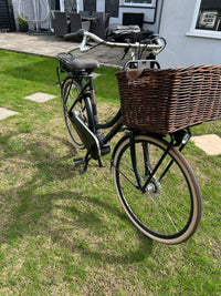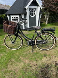 Used The Cortina E-U4 Ladies Dutch City Style Electric Bike in black, with brown tyres is a stylish and practical choice for women looking for a comfortable and efficient mode of transport. With features such as LED lights, a kickstand, reflectors, and mudguards, this bike offers both safety and convenience. The step-through frame and adjustable seat ensure a comfortable riding experience, while the front and rear bike racks provide additional storage options. Complete with Basil branded basket , bell and integrated lock system, this electric bike is a reliable and practical choice for everyday use. Bought brand new in June 2022 from the Netherlands. Paid 2,800 euros. Still sells for similar price. Has done 120 miles. Very rare bike in the UK . Has a Bosch 36v 500Wh battery. Bosch drive unit . 7 gears. Fully enclosed chain. Excellent condition as hardly used. Whoever buys it will love it. I’m only selling as handlebars are wide due to sit up position and it’s too big to go on the back of our campervan, so I need something a little more compact.