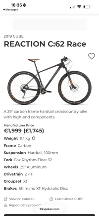 Used Weight 11.1kg Q Frame Carbon Suspension Hardtail, 100mm Fork Fox Rhythm Float 32 Wheels 29" Aluminum Drivetrain 2 × 11 Groupset XT Brakes Shimano XT Hydraulic Disc New hope wheels and hubs New tyres New grips New seatUpgrades: