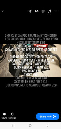 Used Has around £2800 worth of parts on this custom DMR 2020 frame was hand picked there is not another frame like this bike out on the market frame is 1980s colours old school style with a touch of the 2025th generation technology wheels front and back are £700 raceface hop 4 rims any more information check my first picture ill leave the googling to you you can check it over yourself for pricing had the bike done it up around a year ago but I've passed my cbt and just purchased my first 125cc so I don't ever use it any more and it's such a shame to just collect dust tires are basically brand new full tread on both wheels first to see would buyUpgrades: