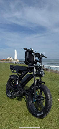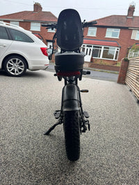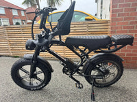 Used Bike is fully equipped with powerful hydraulic brakes for optimal safety. Whether you have to stop suddenly in the city or ride on rough terrain, you'll always remain in control. No more flat tires: Thanks to Kenda anti-puncture technology, you can drive relaxed without worrying about punctures. Less maintenance, more fun! Effortless acceleration: The smart rotation sensor ensures a smooth start at traffic lights, zebra crossings, or steep hills. Comfortable and powerful driving has never been easier. Protected chain: The chain guard extends the life of your chain and provides extra safety while cycling. Adjustable lighting: Choose between low beam for extended battery life or high beam for optimal visibility in the dark. Ergonomic Handlebar: The raised handlebar provides a comfortable position, ideal for longer rides or taller riders. Comfortable saddle: The new, luxurious design offers extra support and a stylish finish. Strong and robust: The improved frame, stronger welds, and better suspension make this fat bike even more durable and reliable. User-friendly operation: The redesigned buttons are more intuitive and built to last. Long range: Up to 60 km of riding pleasure on a single charge, and the battery is fully charged again within 6 hours. Ready for any challenge: With thick tires and a load capacity of 150 kg, this fat bike is suitable for all seasons and terrains. Extra comfort: Equipped as standard with handy extras such as an alarm system, telephone bag and footrests for two people. • Extra: LED turn signals, USB charger under LCD screen. front & back children seat & wind screen.Upgrades: