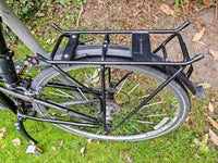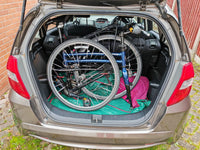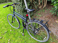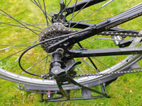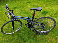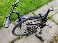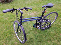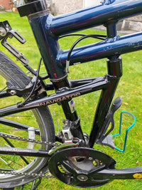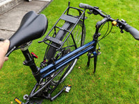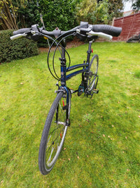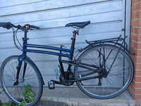 Used Rides like a normal fixed frame due to clever central folding mechanism. It uses all normal off-the-shelf parts such as rim brake pads, chains, and drivetrain. Midnight blue colour Large (21″) frame: For riders 5’11” – 6’4″ (can be adjusted down for shorter people) Handlebar height and seat post are quick and easy to adjust for a perfect fit Weighs 14.5 kg, so is fairly easy to carry Has been well looked after and serviced. Mainly used on holidays (perfect for taking on board cruise ships which only allow folding bikes). Stored inside at home. Shows a few superficial scuff marks - but there is no major corrosion or damage - ready to ride away. Fits easily in the boot of most cars - Honda Jazz shown in photo The following is an edit of the Montague website (Current RRP is £1699 - but new stock in UK is rare nowadays. This one was purchased from Halfords in 2018) The Navigator is a multi-use folding bike with standard 700c wheels. 27 speeds, and calliper brakes. Great for paved roads, and gravel trails. The included RackStand which acts as a cargo carrier, kickstand, mudguard, and folded bike stand also makes it perfect for commuting and touring. In a matter of seconds it folds for the train, car boot, or cupboard A flip of the quick release lever and this bike folds to a compact size. Frame is custom drawn 6061 Series Aluminum with quick release system. Replaceable derailleur hanger and brake mounts. Fork Full Cro-Mo, and ramped dropout. Rims = 700c Alloy. Hubset = Formula, Alloy. quick release. Spokes = 14 Gauge Saddle = Montague original recently replaced. Seatpost 30.0 X 300mm Alloy. Handlebars Alloy, 30mm rise. 600mm wide. Stem Angle adjustable - Octagon brand Shifters Shimano Sora for Flat Handlebar. 3-Speed Left. 9-Speed Right. Front Derailleur Shimano top pull for triple crankset. Rear Derailleur Shimano Sora. 9-Speed. (11-25T rear cassette) Crankset SR Suntour. 48/38/28. Alloy 175mm crank arm Speeds 27 Speeds Brakes conventional callipers Bottom Bracket Sealed CartridgeUpgrades: