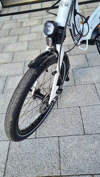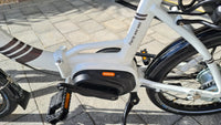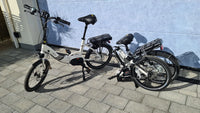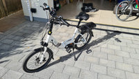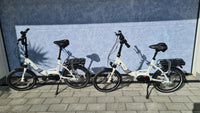 Used Distributed by Leon Cycle, Manchester, I have TWO of these bikes for sale, the price is £700 EACH (original cost £1500 each). The price for the pair is negotiable. Both bikes are in as new condition (max 7 miles use and still got clear plastic protection in place) ideal for general use, with an easy folding procedure, but in our case for carrying on a motorhome; with wheeled carry bag, having a Bafang 250w central motor, enclosed chain and 8 speed Nexus hub gear (means "greasy bits" are enclosed and protected) being the reason for purchase. Battery 36v 14amp (periodically recharged whilst in storage) gives an indicated range up to 66mls. It rides well, with suspension, front RST fork and rear seat post, disk brakes front and rear, integral front and rear lights and Bafang info display. Battery is held and lockable within the rear carrier. Wheels are 20inch, with Schwalbe Big Apple tyres for added comfort. And a bell! The bikes are for sale because my wife preferred towing a car behind the motorhome to do the touristy bits. We downsized to a campervan, but they are just not being used. The bikes have been dry stored in their cases since 2021, with infrequent use since. The carry weight is similar to most other folding electric bikes, and the frame appears to be adjustable for riders between 5ft to 6ft. Max. loading 140kg. The bikes come complete with carry bag, charger and instruction manual. The paint finish is an attractive metallic white.Upgrades: