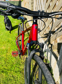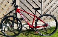 Used Trek dual sport 3 hybrid bike 16 inch frame (M/L) 29 Inch wheels (700c) Shimano deore derailer 1 x 10 gears Hydraulic disc brakes just serviced and working well. Bike is in good working order no issues and has a solid comfortable ride feel. Overall the condition is good there are a few chips and scrapes to the paint work to be expected from a used bike nothing that affects the feel. I have touched up the scratches mentioned but close up they are still visible. Also just to mention. the previous owner had put new pedals on the bike (seen in pics) however they put them on the incorrect side resulting in the left had pedal falling off and the threads being stripped. this has been repaired (pedal arm drilled and tapped ) correct thread sleeve installed. It is barley noticeable now but just wanted to mention that this repair was done on the bike incase you noticed it and wandered what had happened.Upgrades: