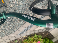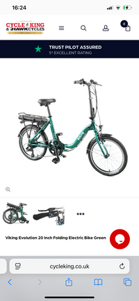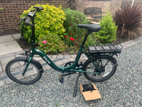 Used Viking Evolution fold away electric bike in green with charger. Immaculate has only had one outing! Great for commuting or camping. RRP £1100 Full working order. Collection Derby DE72 Further info: The Viking Evolution provides an assisted range of up to 30 miles from its powerful 36 Volt 10.4Ah battery. Rather than having a throttle, the motor helps you along when you start to pedal. With a seven speed shimano drivetrain you can still choose a comfortable gear and select the level of motor assistance you require depending on the terrain. Assisted E-bikes are limited to about 15 mph (25kph) and do not require any form of insurance, should you wish the Evolution can be ridden without the battery as a regular bike. At the heart of the Evolution lies a 250 Watt rear hub motor, the 36 volt battery sits neatly in the rear pannier rack for easy fitting/removal. With a low step over height, the aluminium frame can be quickly folded for easy transportation or storage. Equipped with a comfort saddle, full length mudguards and super bright LED lights this Viking bike is ready for anything, from nipping to the shops, your daily commute or trips in the country. The handle bar module provides battery status information via handy LED’s and has a button to adjust the level of assistance. Specification Frame: Alloy Folding Frame with Low Step-Over Tube. Oversize Head Tube. Internal routed e-Cables. Fork: 20″ Hi-Tensile Steel straight power blade. Motor: 36V 250W rear hub motor. Controller: 36V 250W. Display: LED handlebar mounted with multi assist modes. Lights: Front and rear super bright LEDs. Battery: 36V/10.4Ah. Rear carrier battery. Charger: 42V 2Ah. 100-240V voltage. UK type plug. Charge time 4-6 hours. Wheels: Front and rear 20″ x 1.75″ double wall 36 hole black rims. Front 36h, rear with motor. Tyres: City 20″ x 1.75″. Black with black wall. Tubes: Kenda 20″ tube with Schrader valve. Gear Shifter: Shimano Revoshift 7 speed right hand shifter. Rear Derailleur: Shimano Tourney 7 speed. Chain set: 3/32″ x 52 Tooth Steel Prowheel Chainring, 170mm Alloy Cranks. Black. Chain: KMC 1/2″ x 3/32″, Silver. Bottom bracket: Sealed Bearings (2 Pcs). Freewheel: 7 speed indexed Shimano 14-28T. Brakes: Front and rear alloy V type. Alloy three finger levers with quick connect power cut-off. Saddle: Ergonomic comfort rail saddle. Black. Seatpost: Alloy quick release clamp. Black. Stem: Aluminium foldable stem. Black. Handlebar: Promax aluminium riser bars. Black. Headset: Steel, Full Ball Bearing, Semi Hidden, 1.1/8″ Semi-Integrated Threaded with alloy cover. Grips: HL confort grips. Pedals: 9/16″ Alloy/Nylon folding pedals. Mudguards: 20″ chromoplastics. Black with adjustable stays. Carrier: Alloy for integrated battery, 3 pieces. Bell: Integrated on brake lever, Black. Frame Size: 16.5″. Frame Colour: Green. Weight: 18kg.Upgrades: